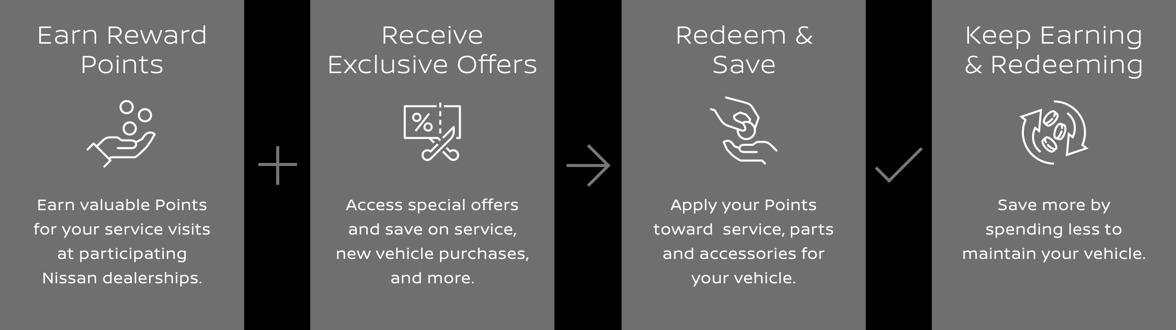 That's where MyNISSAN Rewards comes in introducing a loyalty experience tailored to you and your vehicle — one that puts you in control. Earn rewards for taking care of your vehicle at our dealership and choose to apply them for whatever your vehicle needs. It's easy to join. Here's How It Works: